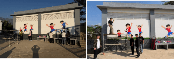 本次墙绘设计紧扣万年塘小学“校园足球特色学校”的办学亮点,以“童真、梦想、奋进!”为核心主题。画面中,孩子们矫健的射门姿态、足球划出的动人弧线与红河县远处的青山、校园风貌巧妙融合,同时也象征美育浸润团队手拉手协作的剪影。鲜艳明快的色彩不仅美化了校园环境,更将足球运动所蕴含的拼搏、协作、规则与快乐理念,以视觉艺术的形式生动呈现,于无声处浸润学子心灵。